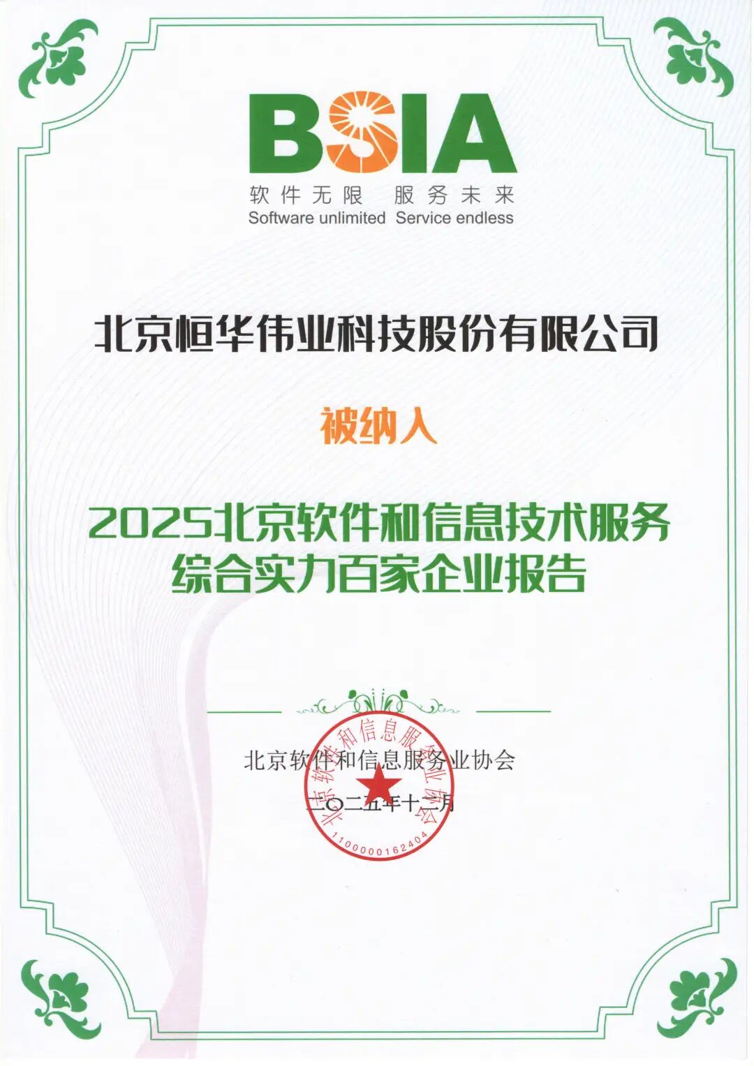 近日,北京软件和信息服务业协会正式发布了《2025北京软件和信息技术服务综合实力百家企业报告》等三项报告。其中,恒华科技荣获“2025北京软件和信息服务业综合实力百家企业”和“2025北京软件核心竞争力企业(技术研发型)”两项荣誉。此次双榜荣登,体现了对公司综合发展实力和技术研发能力的双重认可。