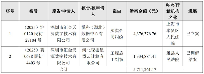 值得一提的是,公告中还披露了汇金股份其他诉讼仲裁事项。截至本公告披露日,公司及控股子公司尚未披露的小额诉讼、仲裁事项共2起,金额合计571.13万元,占最近一期经审计净资产的3.75%,具体如下: