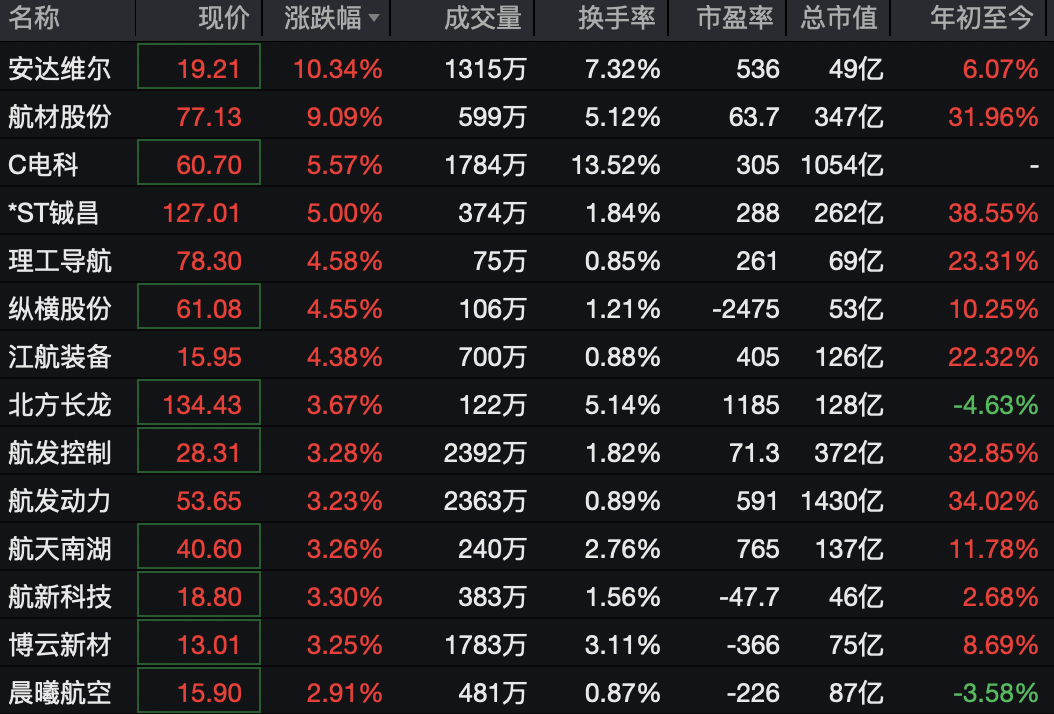 航天军工板块拉升反弹,安达维尔、航材股份、理工导航等涨幅居前。
