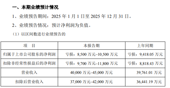 另据公司2025年业绩预告,公司2025年预计营收为4亿元至4.5亿元,归母净利润为亏损8500万元至亏损1.05亿元。