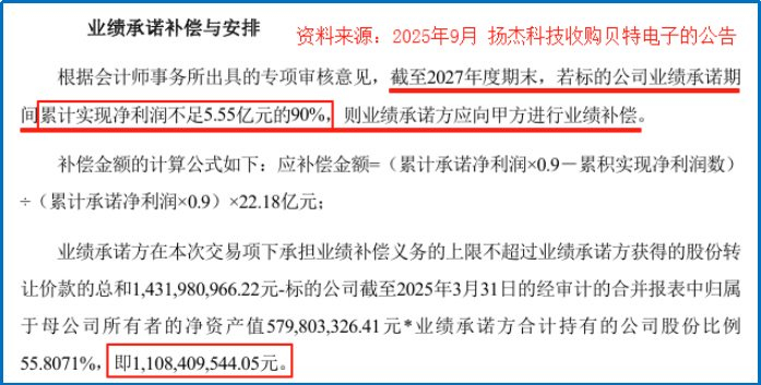 2025-2027年,贝特电子累计净利润不低于5.55亿。如果完成率低于90%(4.995亿),则需要支付最高11.08亿元的补偿。