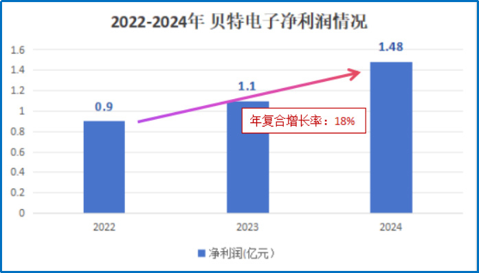 2022年-2024年,贝特电子的净利润分别为9025.17万元、1.1亿元和1.48亿元,三年累计净利润约3.48亿元,年复合增长率为18%。