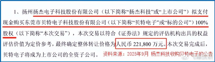 2025年9月,扬杰科技发布公告,拟以22.18亿现金将贝特电子100%股权收入囊中,成为其厉兵秣马史上的最大手笔并购。