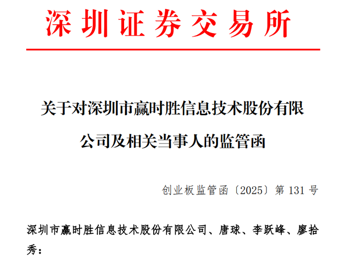 瑞财经 钟鸣辰 10月31日,赢时胜(SZ300377)发布公告称收到深交所创业板公司管理部监管函,公司及公司董事长唐球、总经理李跃峰、财务总监廖拾秀因存在多项会计核算问题而受到责令改正的监管措施。