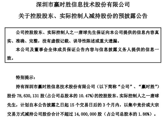 11月7日,赢时胜(300377.SZ)发布公告,持股10.47%的控股股东、实际控制人之一唐球先生,计划自公告披露之日起15个交易日后的3个月内,以集中竞价或大宗交易方式减持公司股份合计不超过1400万股(占公司总股本的1.86%)。
