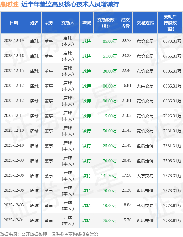 赢时胜近半年内的董监高及核心技术人员增减持详情如下: