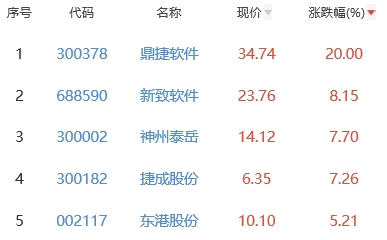 其中,鼎捷软件、新致软件、神州泰岳、捷成股份、东港股份位列板块涨幅前五位,涨幅分别为20.00%、8.15%、7.70%、7.26%、5.21%。