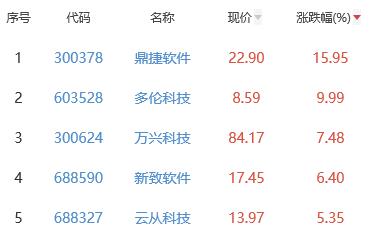 其中,鼎捷软件、多伦科技、万兴科技、新致软件、云从科技位列板块涨幅前五位,涨幅分别为15.95%、9.99%、7.48%、6.40%、5.35%。