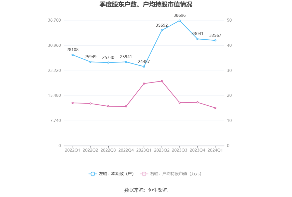 筹码集中度方面,截至2024年一季度末,公司股东总户数为3.26万户,较上年末下降了474户,降幅1.43%;户均持股市值由上年末的17.37万元下降至15.17万元,降幅为12.67%。
