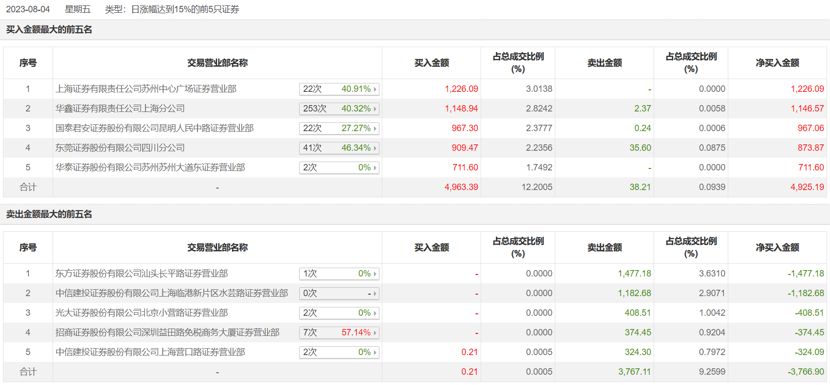 具体来看,上海证券苏州中心广场证券营业部、华鑫证券上海分公司分别买入1226.09万元、1148.94万元;东方证券汕头长平路证券营业部、中信建投证券上海临港新片区水芸路证券营业部分别卖出1477.18万元、1182.68万元。