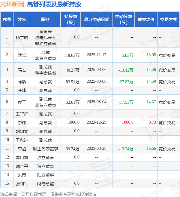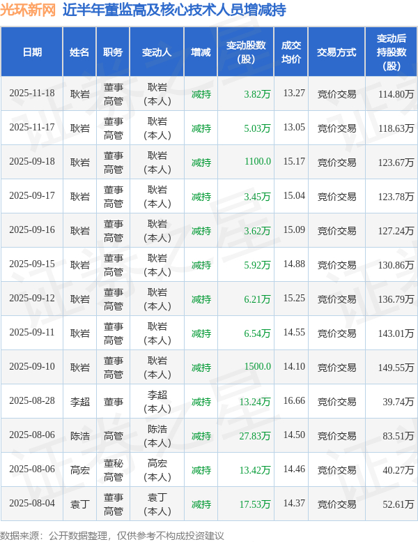 光环新网近半年内的董监高及核心技术人员增减持详情如下: