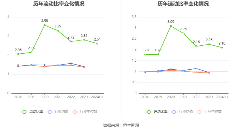 2024年上半年,公司流动比率为2.61,速动比率为2.10。