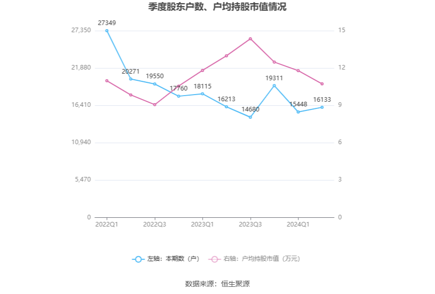 筹码集中度方面,截至2024年上半年末,公司股东总户数为1.61万户,较一季度末增长了685户,增幅4.43%;户均持股市值由一季度末的11.79万元下降至10.73万元,降幅为8.99%。