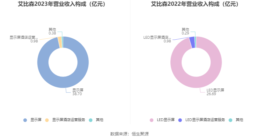 分产品来看,2023年公司主营业务中,显示屏收入38.70亿元,同比增长44.98%,占营业收入的96.59%;显示屏酒店运营服务收入0.98亿元,同比下降0.22%,占营业收入的2.45%;储能设备收入379.47万元,占营业收入的0.09%。