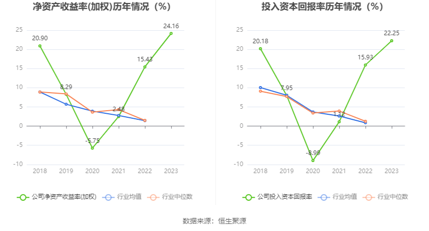 数据显示,2023年公司加权平均净资产收益率为24.16%,较上年同期增长8.73个百分点;公司2023年投入资本回报率为22.25%,较上年同期增长6.32个百分点。