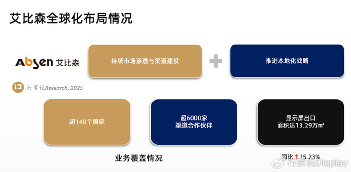 下面,我们从市场视角及产品策略分析艾比森的经营情况。■ 海外板块多元化布局,全球化根基不断巩固2025年上半年,艾比森显示屏出口面积达到13.29万平方米,同比增长15.23%。截至报告期末,艾比森业务已覆盖超140个国家,拥有超过6000家渠道合作伙伴,全球化根基不断巩固。