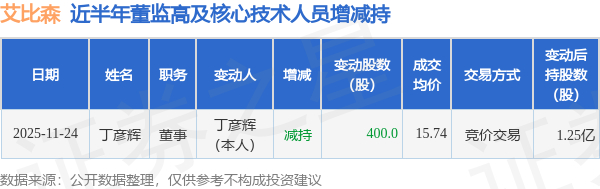 艾比森:11月24日高管丁彦辉减持股份合计400股