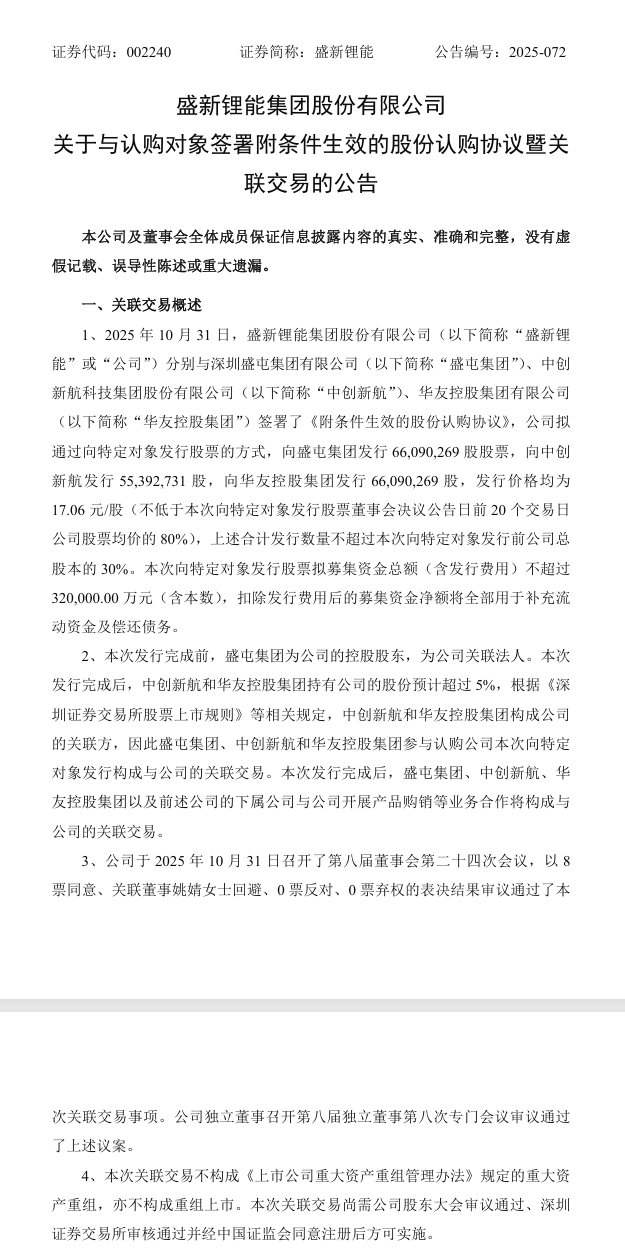 同日晚间,盛新锂能发布公告称,公司终止筹划港股IPO事项,并且拟通过定增方式引入战略投资者,包括中创新航、华友控股集团有限公司。