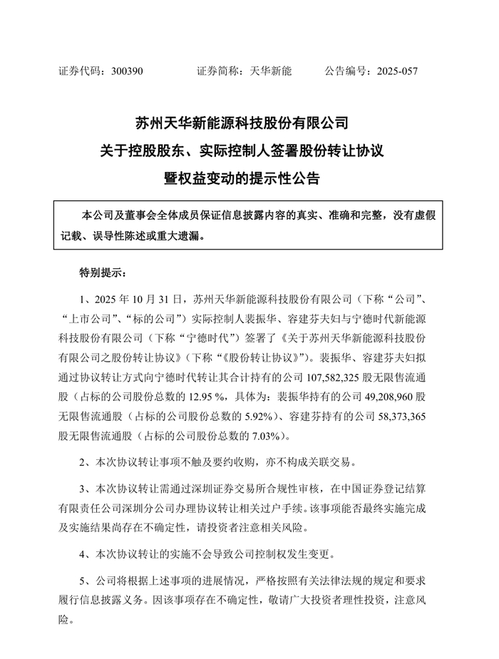 #天华新能实控人夫妇作价26亿转让股票#【#宁德时代与中创新航均入股材料企业#】10月31日晚间,天华新能发布公告称,公司实控人裴振华、容建芬夫妇拟通过协议转让方式,向宁德时代合计转让所持12.95%的公司股份,转让价款合计达26.35亿元。