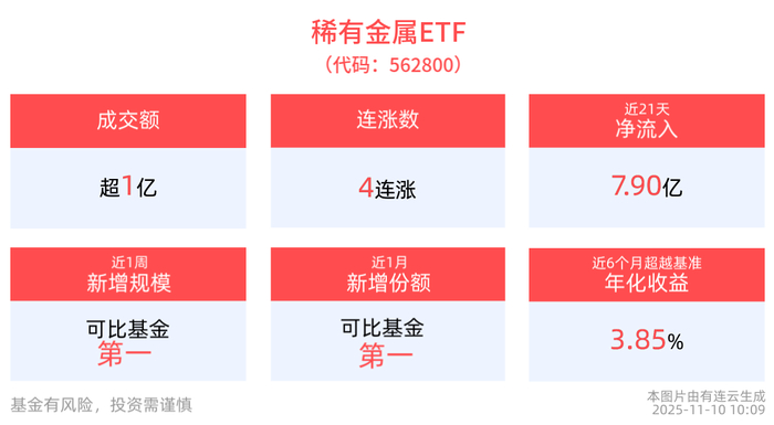 截至2025年11月10日10:09,中证稀有金属主题指数上涨0.28%,成分股天华新能上涨8.08%,盛新锂能上涨4.80%,西藏矿业上涨4.47%,中矿资源上涨3.71%,融捷股份上涨3.69%。稀有金属ETF(562800)上涨0.34%,冲击4连涨。