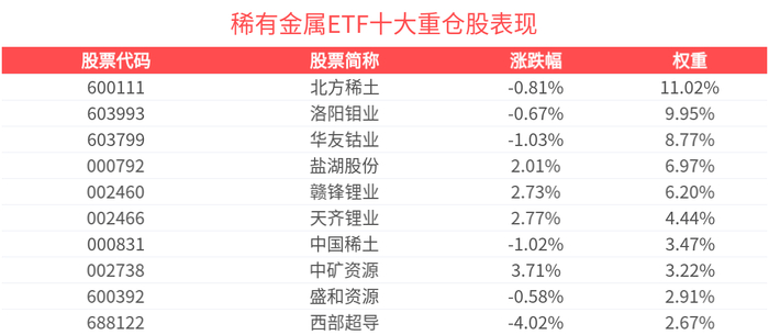 数据显示,截至2025年10月31日,中证稀有金属主题指数前十大权重股分别为北方稀土、洛阳钼业、华友钴业、盐湖股份、赣锋锂业、天齐锂业、中矿资源、中国稀土、西部超导、厦门钨业,前十大权重股合计占比60%。