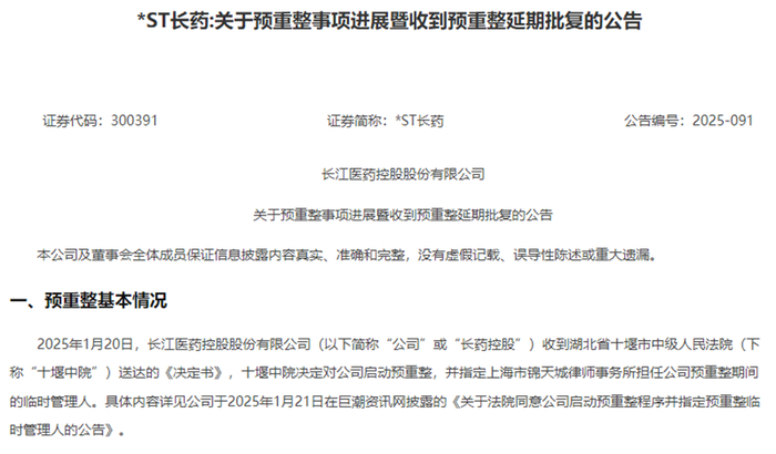 2025年10月20日,长江医药控股股份有限公司(*ST长药,证券代码:300391)发布关于预重整事项进展暨收到预重整延期批复的公告。2025年10月17日,公司收到十堰中院出具的(2024)鄂03破申76号《批复》,十堰中院决定同意公司预重整期间延长三个月,即延长至2026年1月20日。公司表示,长江星等七家子公司合并重整能否成功尚存在不确定性,且公司股票交易存在被终止上市的风险。