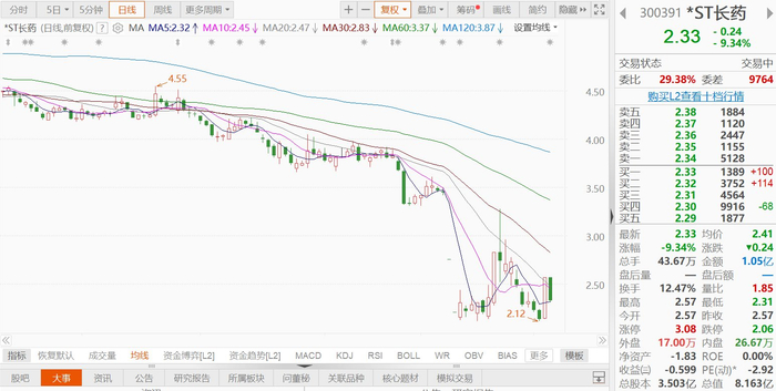 A股异动丨*ST长药跌逾9%,因涉嫌财务数据虚假记载被立案