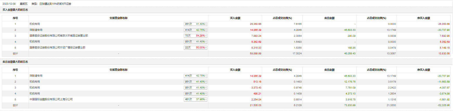 12月8日,天孚通信今日涨17.84%,全天换手率达10.3%,振幅达19.25%。龙虎榜数据显示,营业部席位合计净卖出7757.5万元。其中,机构买入3.61亿元,卖出2.43亿元,合计净买入1.18亿元。此外,深股通专用、作手新一(国泰君安证券南京太平南路证券营业部)分别买入1.49亿元、7983.24万元;深股通专用、中国国际金融上海分公司分别卖出4.56亿元、3916.75万元。