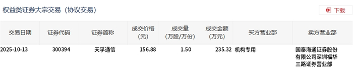 天孚通信今日大宗交易平价成交1.5万股,成交额235.32万元