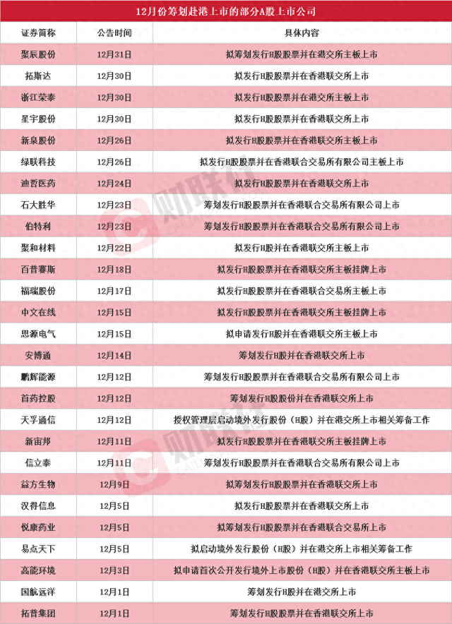 财联社1月2日讯(编辑 平方)A股公司赴港上市热潮延续。据财联社不完全统计,截至发稿,12月份共有27家A股上市公司公告筹划赴港上市,包括聚辰股份、拓斯达、浙江荣泰、星宇股份、新泉股份、绿联科技、迪哲医药、石大胜华、伯特利、聚和材料、百普赛斯、福瑞股份、中文在线、思源电气、安博通、鹏辉能源、首药控股、天孚通信、新宙邦、信立泰、益方生物、汉得信息、悦康药业、易点天下、高能环境、国航远洋、拓普集团,详细情况见下图: