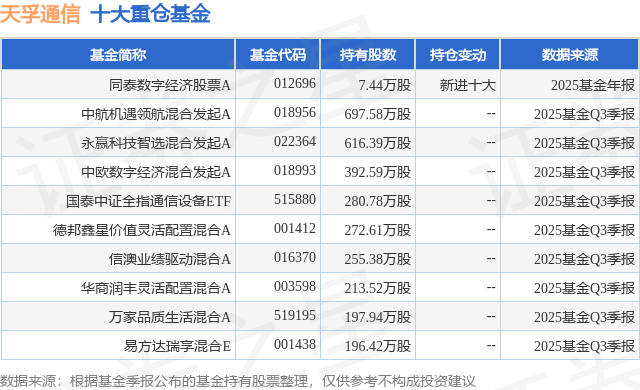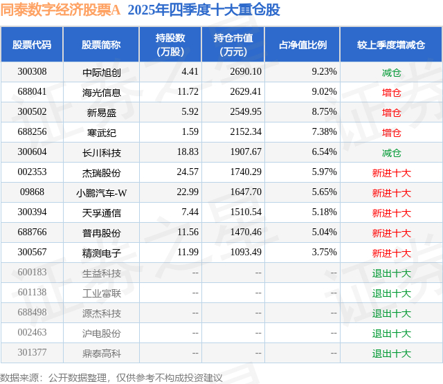 根据2025基金年报公募基金重仓股数据,重仓该股的公募基金共1家,其中持有数量最多的公募基金为同泰基金的同泰数字经济股票A。同泰数字经济股票A目前规模为0.55亿元,最新净值1.3026(1月12日),较上一交易日上涨1.35%,近一年上涨105.2%。该公募基金现任基金经理为陈宗超。陈宗超在任的基金产品包括:同泰行业优选股票A,管理时间为2023年4月7日至今,期间收益率为-14.34%;同泰慧利混合A,管理时间为2025年5月12日至今,期间收益率为37.42%;同泰新能源1年持有股票A,管理时间为2025年5月12日至今,期间收益率为76.34%。