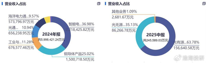 来源:同花顺iFinD— 亨通光电(左)天孚通信(右) 注:亨通光电数据采用最近披露的2024年年报产品营收占比