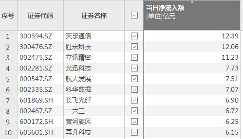 上证报中国证券网讯(记者 汪友若)Choice数据显示,3月10日,资金净流入额排名前十的个股依次是天孚通信、胜宏科技、立讯精密、光迅科技、航天发展、科华数据、长飞光纤、二六三、黄河旋风、再升科技。其中,天孚通信获资金净流入12.39亿元。
