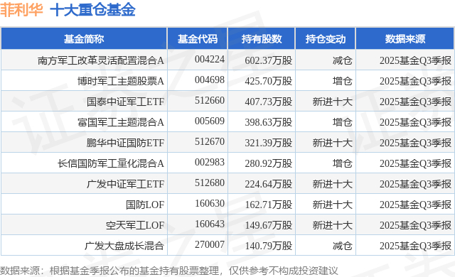 根据2025基金Q3季报公募基金重仓股数据,重仓该股的公募基金共78家,其中持有数量最多的公募基金为南方基金的南方军工改革灵活配置混合A。南方军工改革灵活配置混合A目前规模为36.47亿元,最新净值1.3361(12月23日),较上一交易日下跌1.26%,近一年上涨16.2%。该公募基金现任基金经理为邹承原。邹承原在任的基金产品包括:南方领航优选混合A,管理时间为2022年11月18日至今,期间收益率为-6.55%。