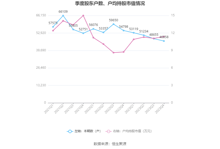 筹码集中度方面,截至2023年年末,公司股东总户数为4.69万户,较三季度末下降了1797户,降幅3.69%;户均持股市值由三季度末的11.08万元上升至11.40万元,增幅为2.89%。