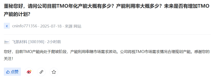 7月28日,飞凯材料(300398)在互动平台上表示,目前TMO产能尚处于爬坡阶段,产能利用率随市场需求波动。公司将视TMO市场需求情况合理规划产能。