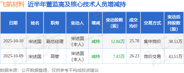 飞凯材料:10月9日高管宋述国减持股份合计7.83万股