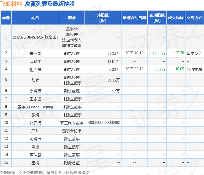 飞凯材料的高管列表及最新持股情况如下: