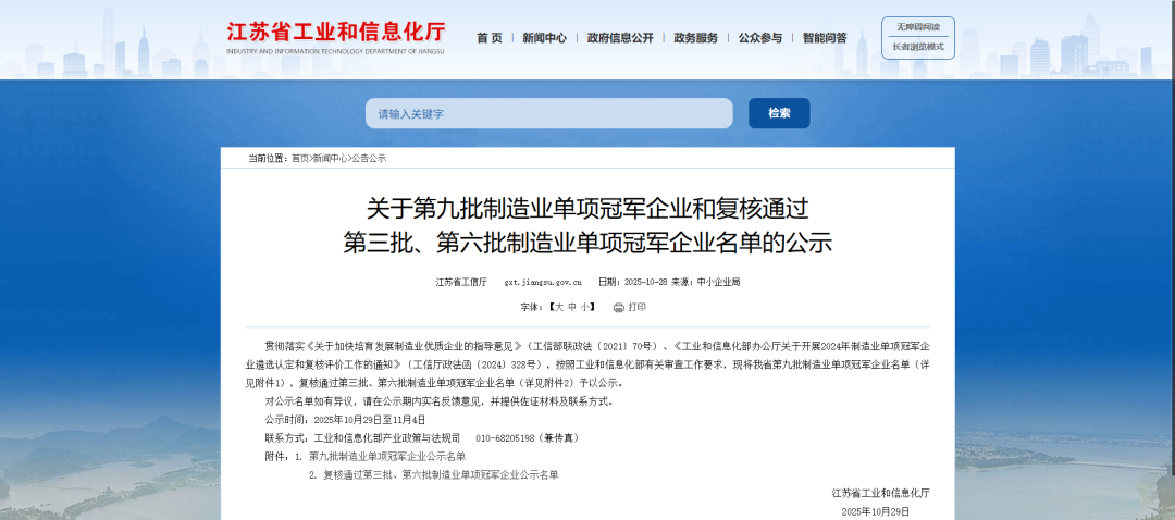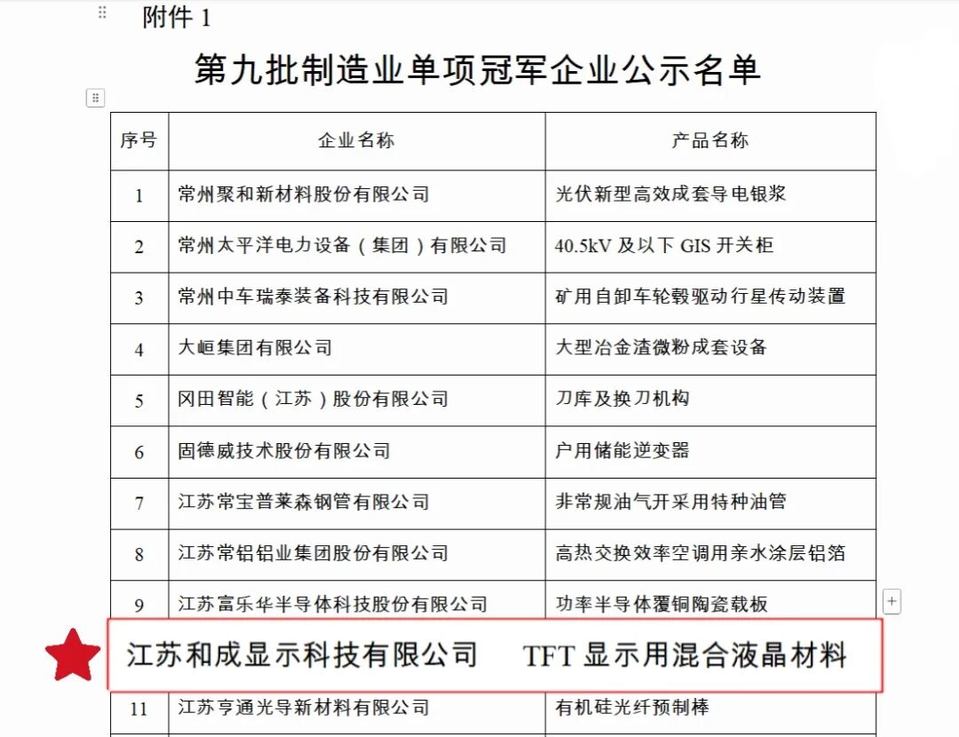 近日,根据国家工业和信息化部统一部署,江苏省工业和信息化厅对拟认定的第九批国家制造业单项冠军企业名单进行公示。飞凯材料控股子公司——江苏和成显示科技有限公司凭借在新型显示材料领域的突出技术实力与市场表现,成功入选国家制造业单项冠军企业。