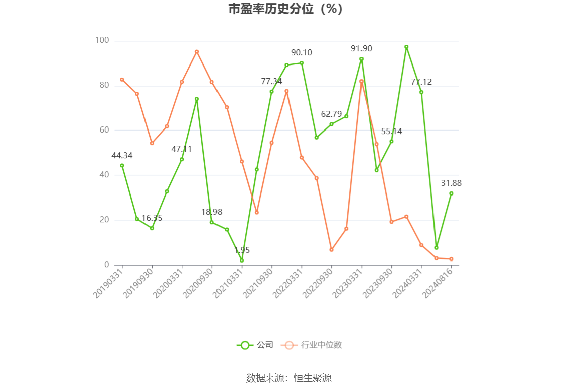 市盈率为负时,不显示当期分位数,会导致折线图中断。