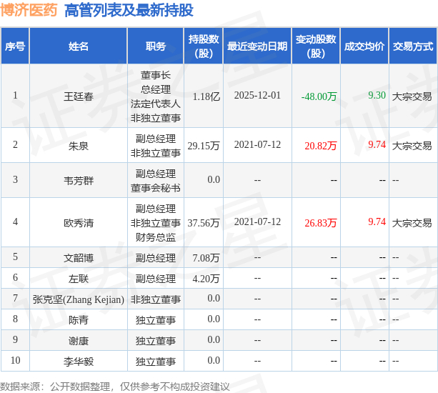 博济医药近半年内的董监高及核心技术人员增减持详情如下: