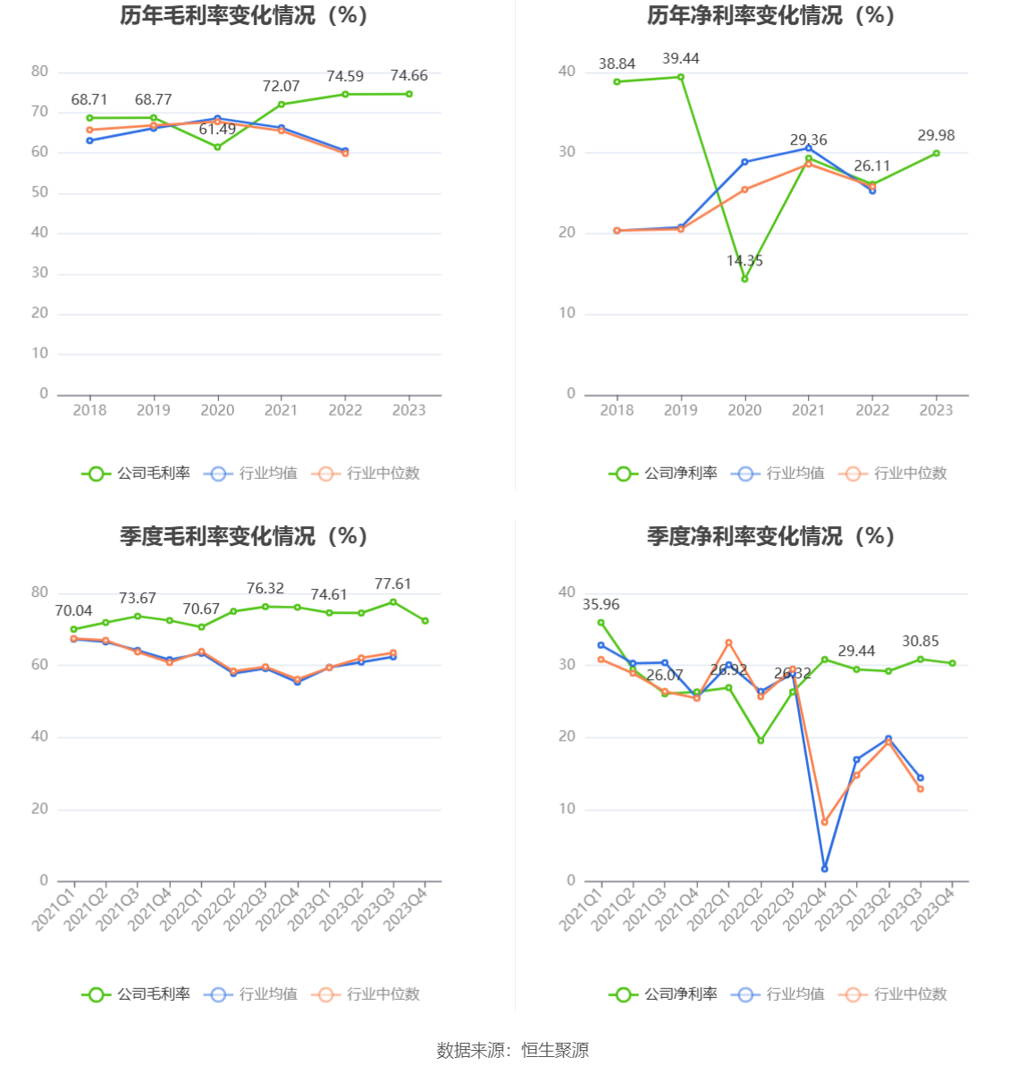 2023年,公司毛利率为74.66%,同比上升0.07个百分点;净利率为29.98%,较上年同期上升3.87个百分点。从单季度指标来看,2023年第四季度公司毛利率为72.38%,同比下降3.77个百分点,环比下降5.23个百分点;净利率为30.31%,较上年同期下降0.51个百分点,较上一季度下降0.54个百分点。