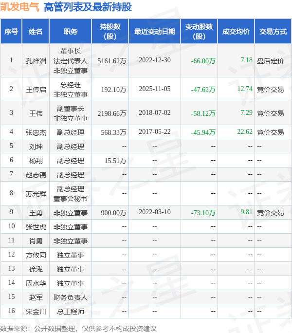 凯发电气近半年内的董监高及核心技术人员增减持详情如下: