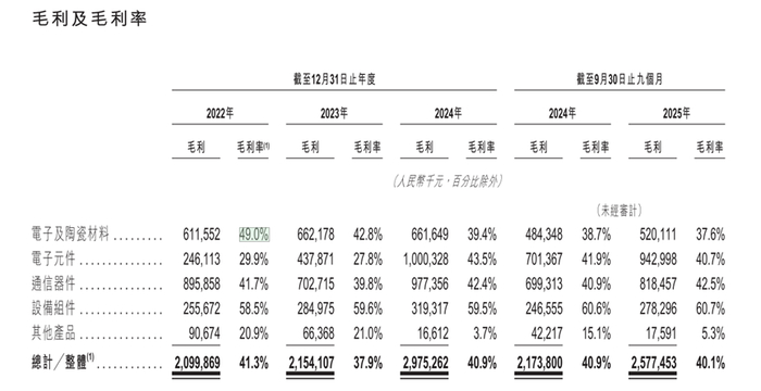 三环集团通信器件业务的毛利率也比较稳定,各期分别为41.7%、39.8%、42.4%、42.5%。而近年来增长迅猛的电子元件业务毛利率在2024年出现明细上扬,业务各期毛利率分别为29.9%、27.8%、43.5%及40.7%。