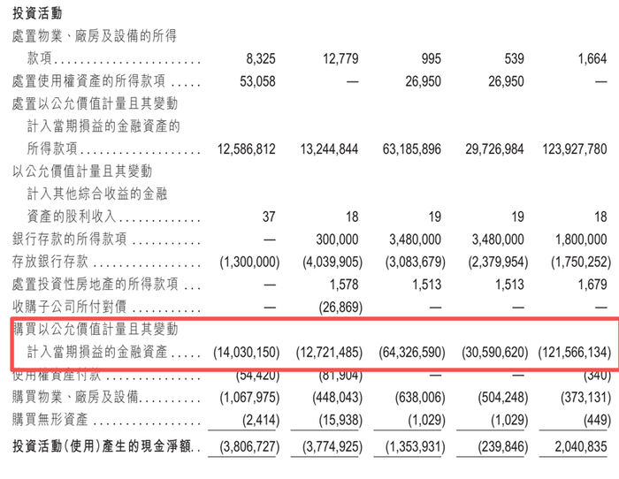 购买金融资产为三环集团投资现金的主要流出项,各期流出资金140.3亿元、127.21亿元、643.27亿元、1215.66亿元。