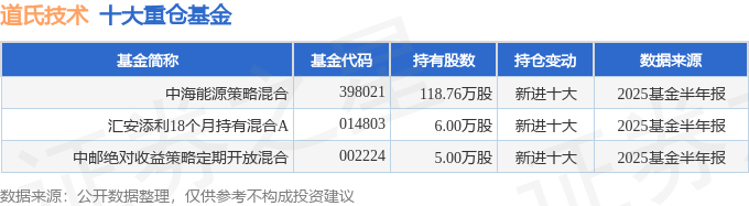 持有道氏技术最多的基金为中海能源策略混合,目前规模为7.73亿元,最新净值0.7368(10月10日),较上一交易日下跌5.38%,近一年上涨15.16%。该基金现任基金经理为姚晨曦。