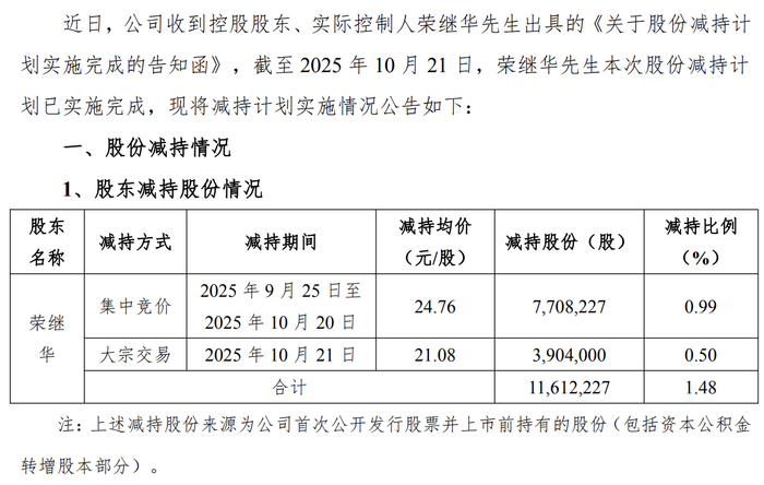 图源:公司官网10月21日,道氏技术(300409.SZ)公告称,截至当日,公司控股股东、实控人荣继华股份减持计划实施完成。这轮减持计划6月30日披露,减持比例1.48%,按减持均价计算共套现约2.73亿。