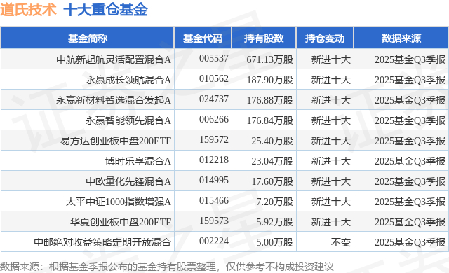 重仓道氏技术的前十大公募基金请见下表: