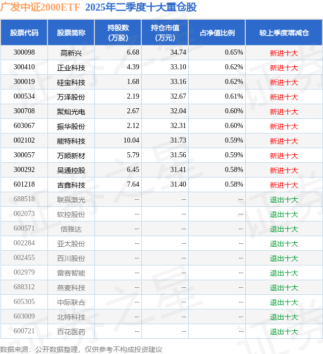 根据2025基金半年报公募基金重仓股数据,重仓该股的公募基金共1家,其中持有数量最多的公募基金为广发基金的广发中证2000ETF。广发中证2000ETF目前规模为0.54亿元,最新净值1.4648(10月9日),较上一交易日上涨0.96%,近一年上涨52.39%。该公募基金现任基金经理为夏浩洋。夏浩洋在任的基金产品包括:广发中证光伏产业指数A,管理时间为2021年7月6日至今,期间收益率为-28.37%;广发海外中国互联网30(QDII-ETF),管理时间为2021年11月24日至今,期间收益率为26.59%;广发中证光伏龙头30ETF,管理时间为2022年11月24日至今,期间收益率为-30.12%;广发中证环保ETF联接A,管理时间为2023年5月15日至今,期间收益率为3.57%。