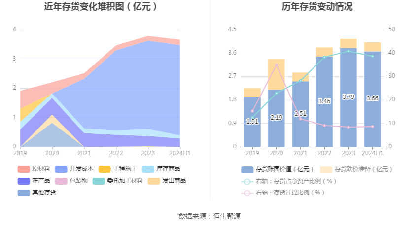 从存货变动来看,截至2024年上半年末,公司存货账面价值为3.66亿元,占净资产的38.63%,较上年末减少1277.21万元。其中,存货跌价准备为3478.89万元,计提比例为8.68%。